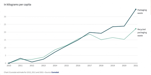 Sebbene i tassi di riciclaggio nella UE siano aumentati del 23% rispetto al 2010, ciò non è stato sufficiente per tenere il passo con l’aumento della quantità totale di rifiuti di imballaggio generati.