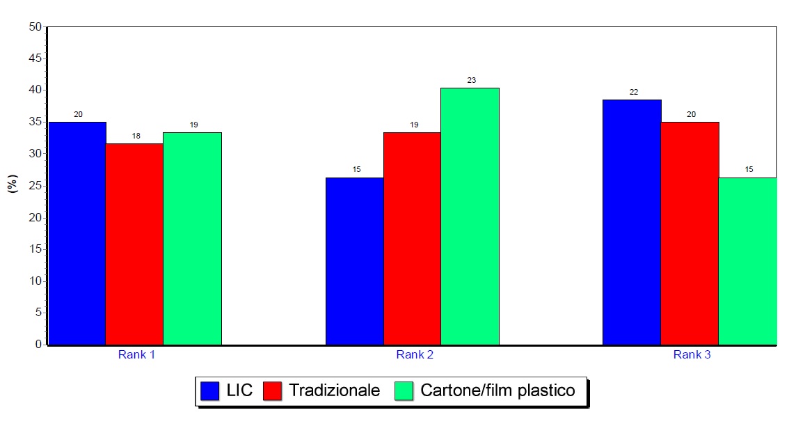 Come si può notare, le distribuzioni di scelta dei ranghi sono meno diversificate rispetto alla lasagna. Infatti 20 soggetti hanno indicato come preferita la crostata cotta in HT Board®, 19 soggetti nel “Cartone/film plastico” e 18 nel “Tradizionale” alluminio.